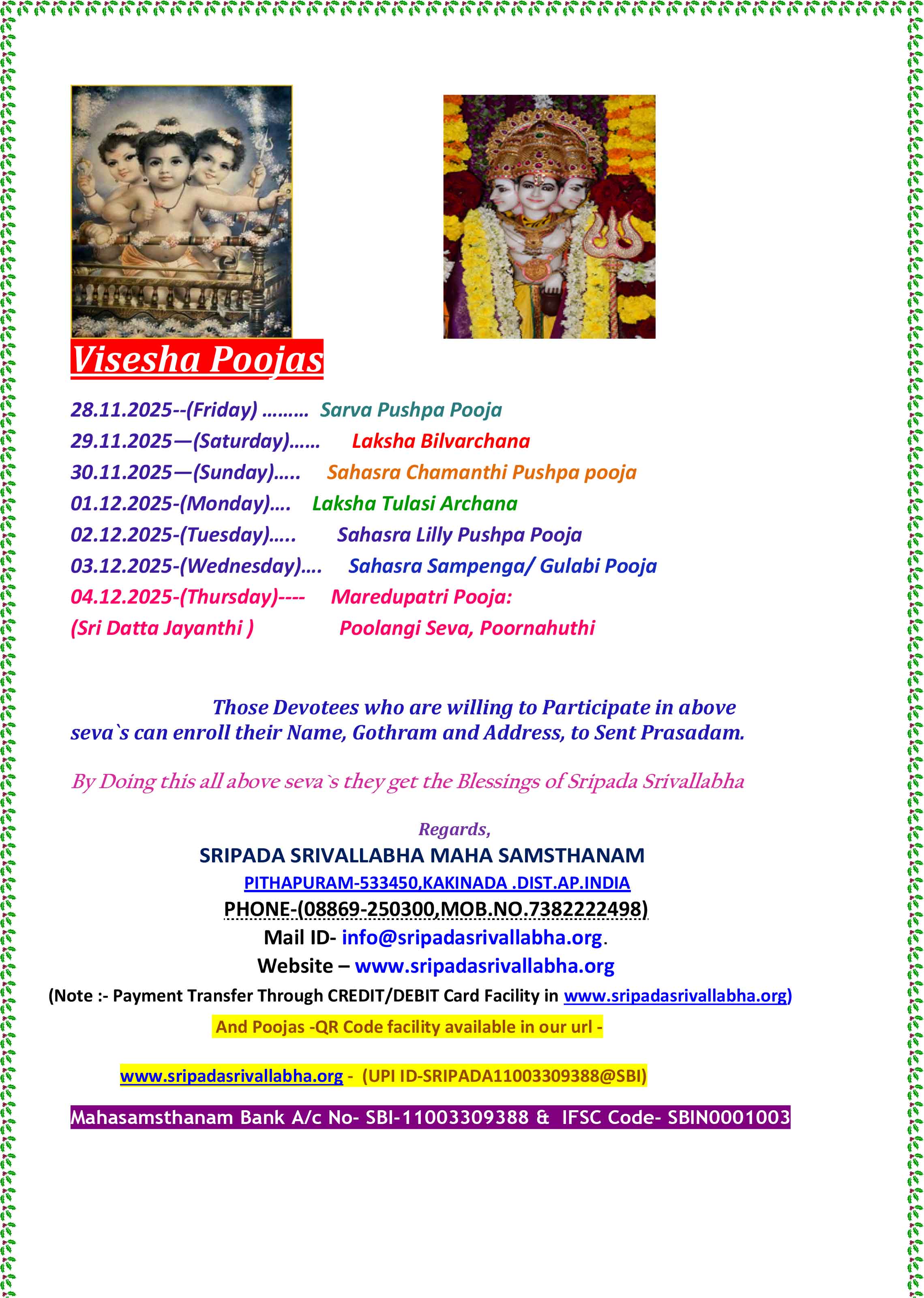 IMP Notice for Annadanam and Seva Donations: Due to technical issues in Online Payment System Devotees are requested to use the below QR CODE for Annadanam and Sevas. After Scanning the QR Code (Click on this message to get the QR Code), please send Payment Details Screenshot to info@sripadasrivallabha.org