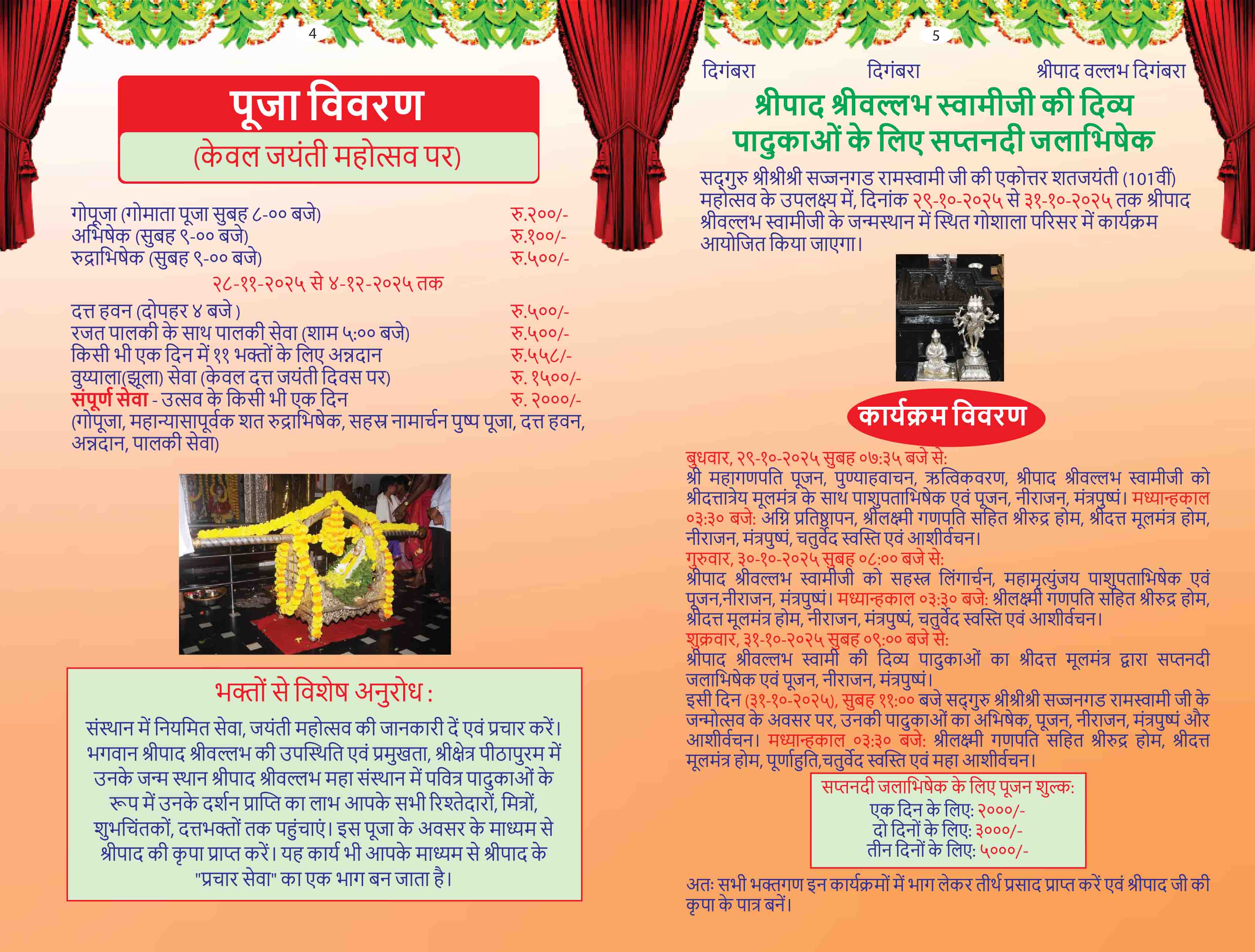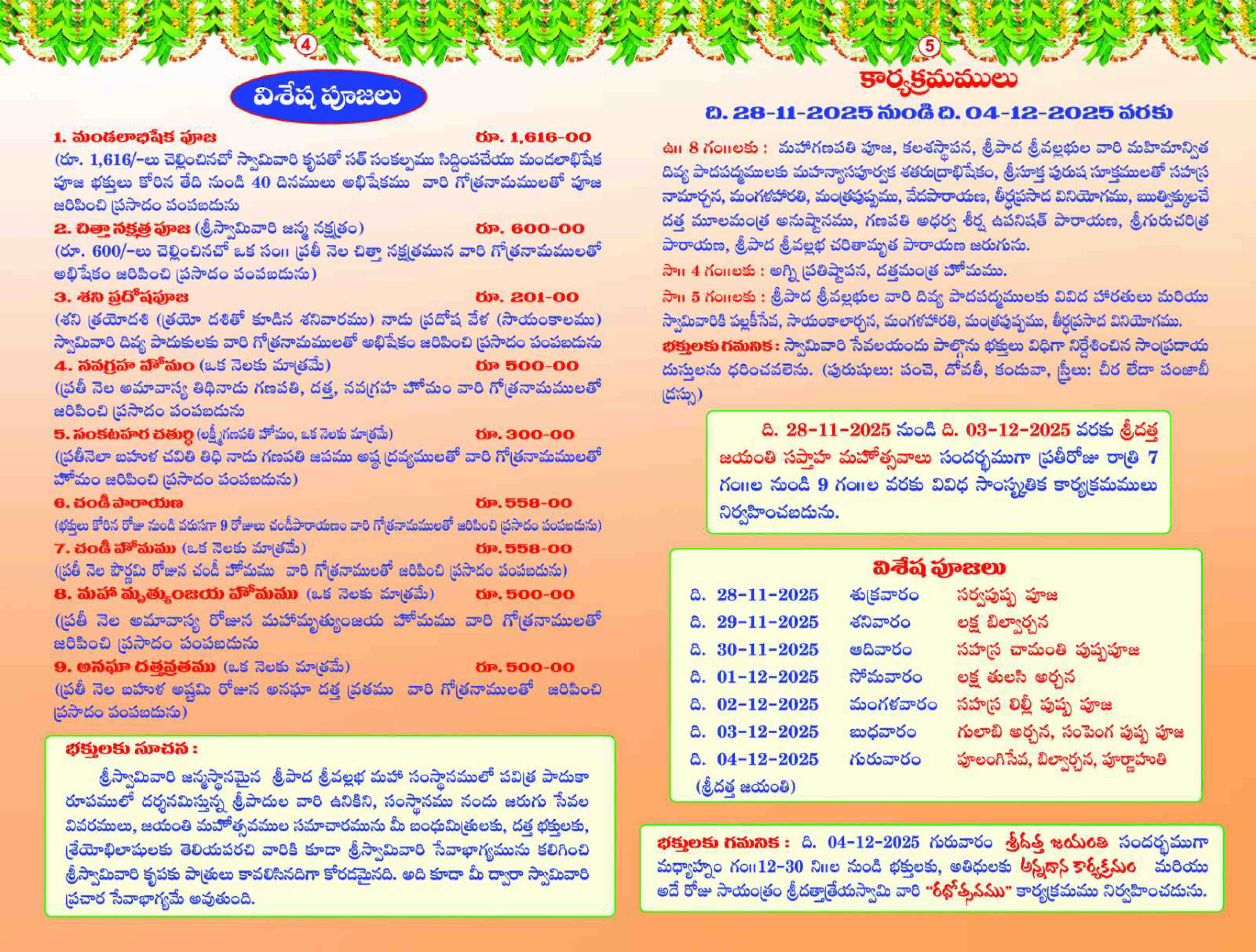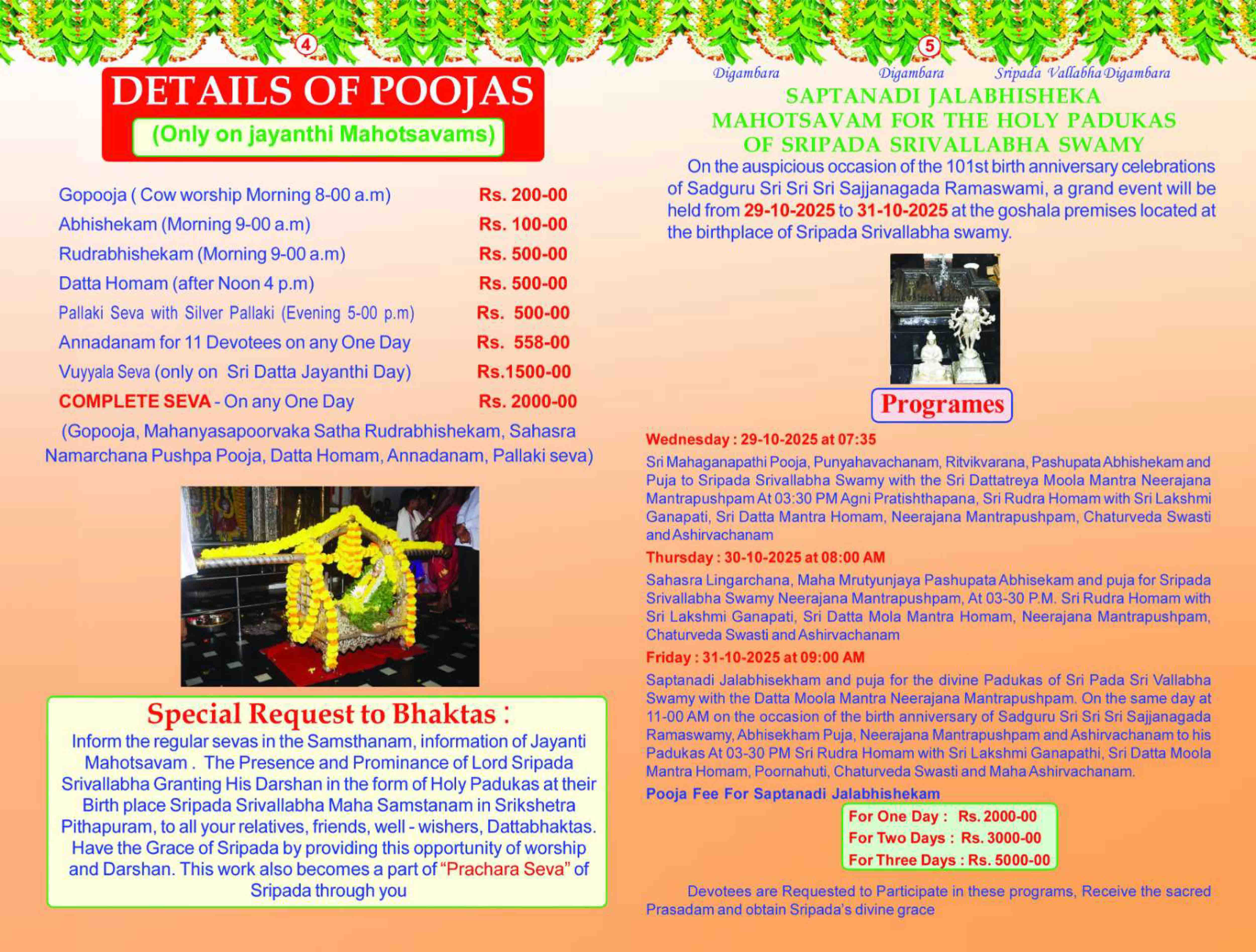 Abhishek with Panchamrutha to the lotus feet of Sree Swami and worship. Afterwards offering of Harathi and recitation of Mantra Pushpa, distribution of Prasadam.    9.00 a.m
