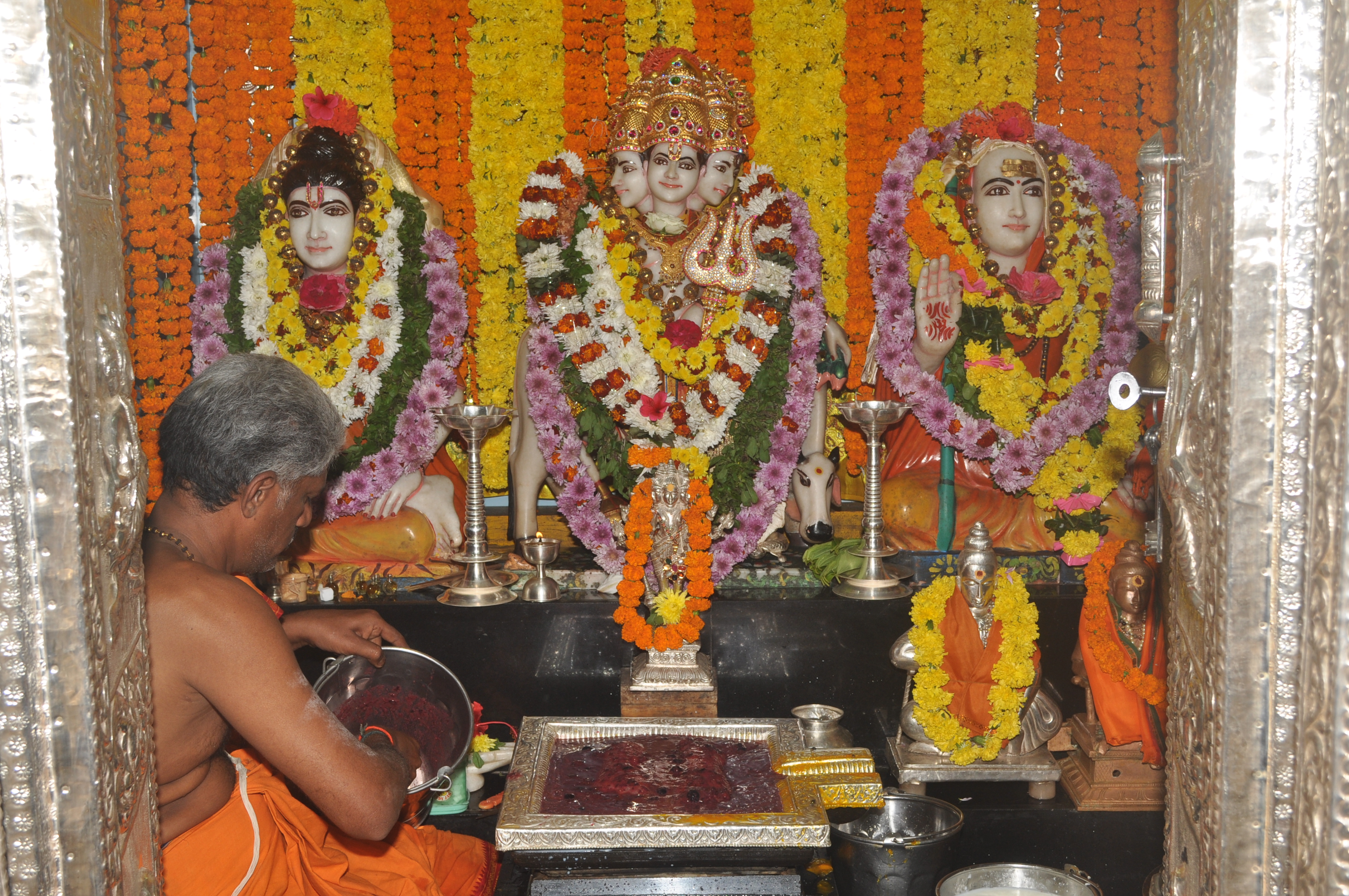 Rudraabhisheka Sahita Maha Pooja The Lotus feet of the lord are being Worshipped with Eleven items (Cow Milk, Cow Curd, Cow Ghee, Honey, Sugar, Sandal Wood, Vibhuthi, Perfume, Rosewater, Fruit Juice and Vattiverllu) 11 times along with Rudranamaka chamakams, by the purohits. Of the 'Thrimurthis' Rudra is one , who is Fond of Abhishekam and Lord Sripada Srivallabha is the incarnation of Dattatreya who is the embodiment of the Thrimurthis, this Abhishekam is very much liked by him.So all the Devotees are requested to take port in doing this Abhishekam to the Lord and get his blessings in plenty